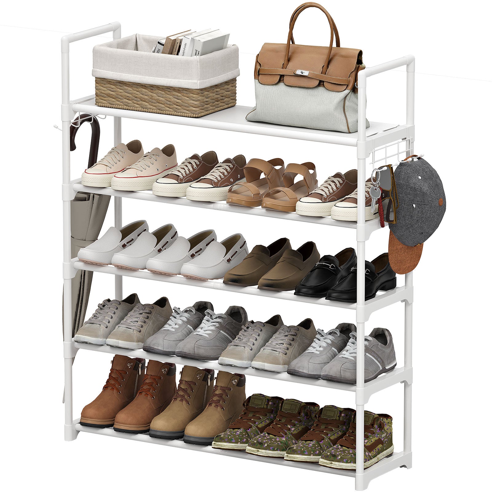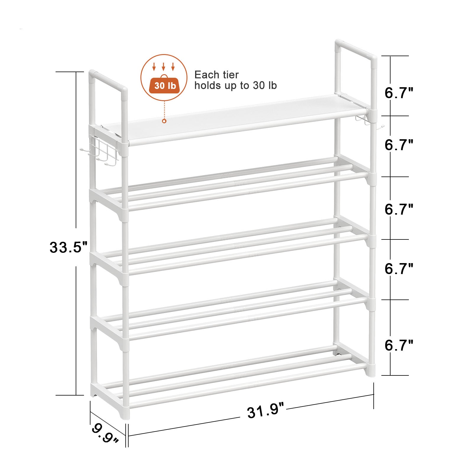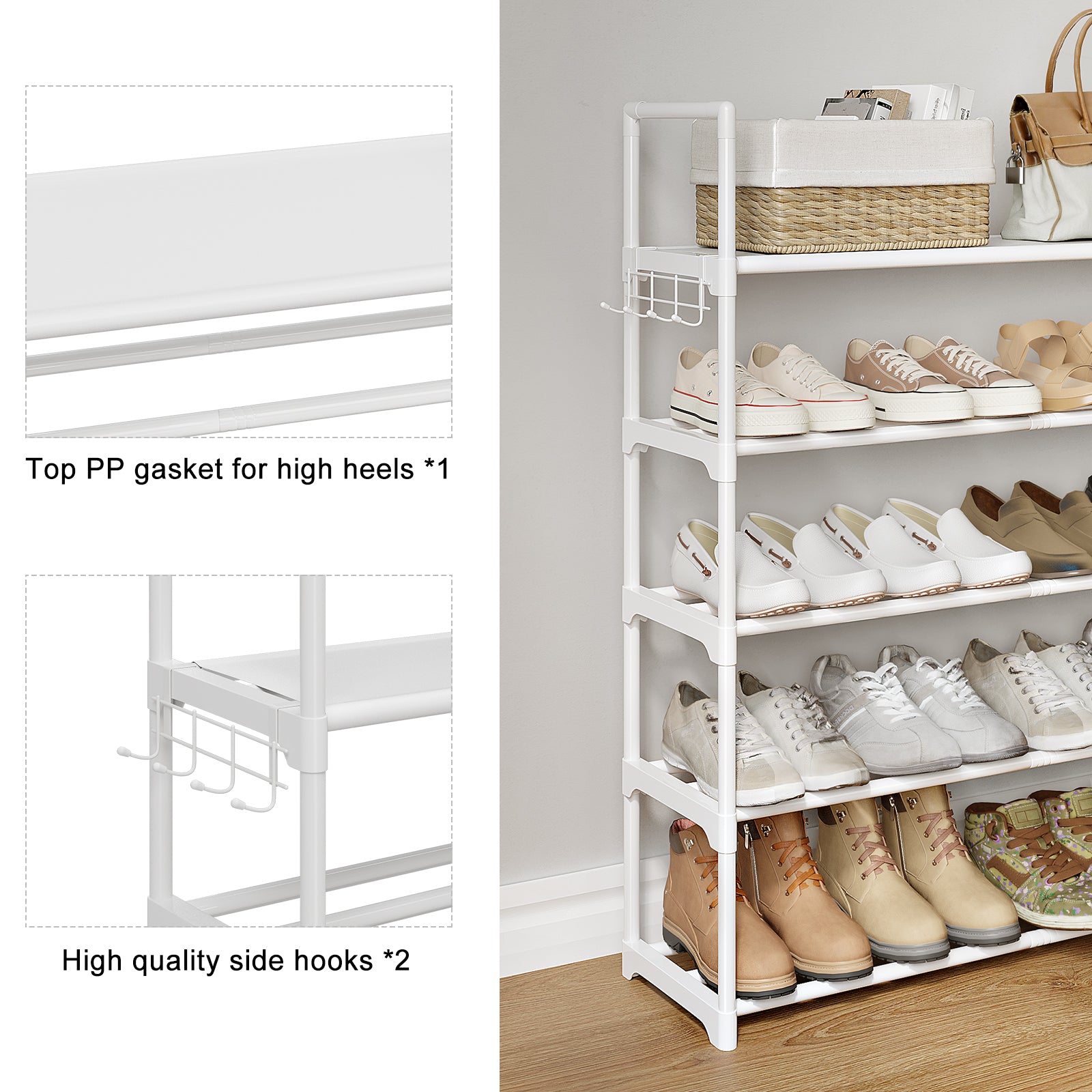 [Utility Storage]: The metal shoe rack has 5 tiers and can easily hold up to 20 pairs of shoes. A PP gasket is on the top shelf for easily storing your high heels. Additional hooks on the side can be used to hang small accessories such as hats, keys, and umbrellas.