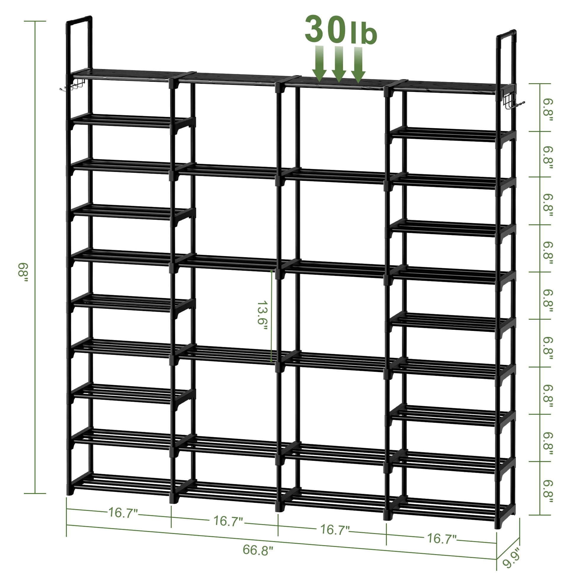 - [Large Capacity Shoe Organizer]: The fully assembled size of this shoe holder is 66.8”W x 9.9”D x 68”H. 10 Tiers provide more space to extend upwards and can store up to 65-70 pairs of shoes, making your space more tidy and organized.