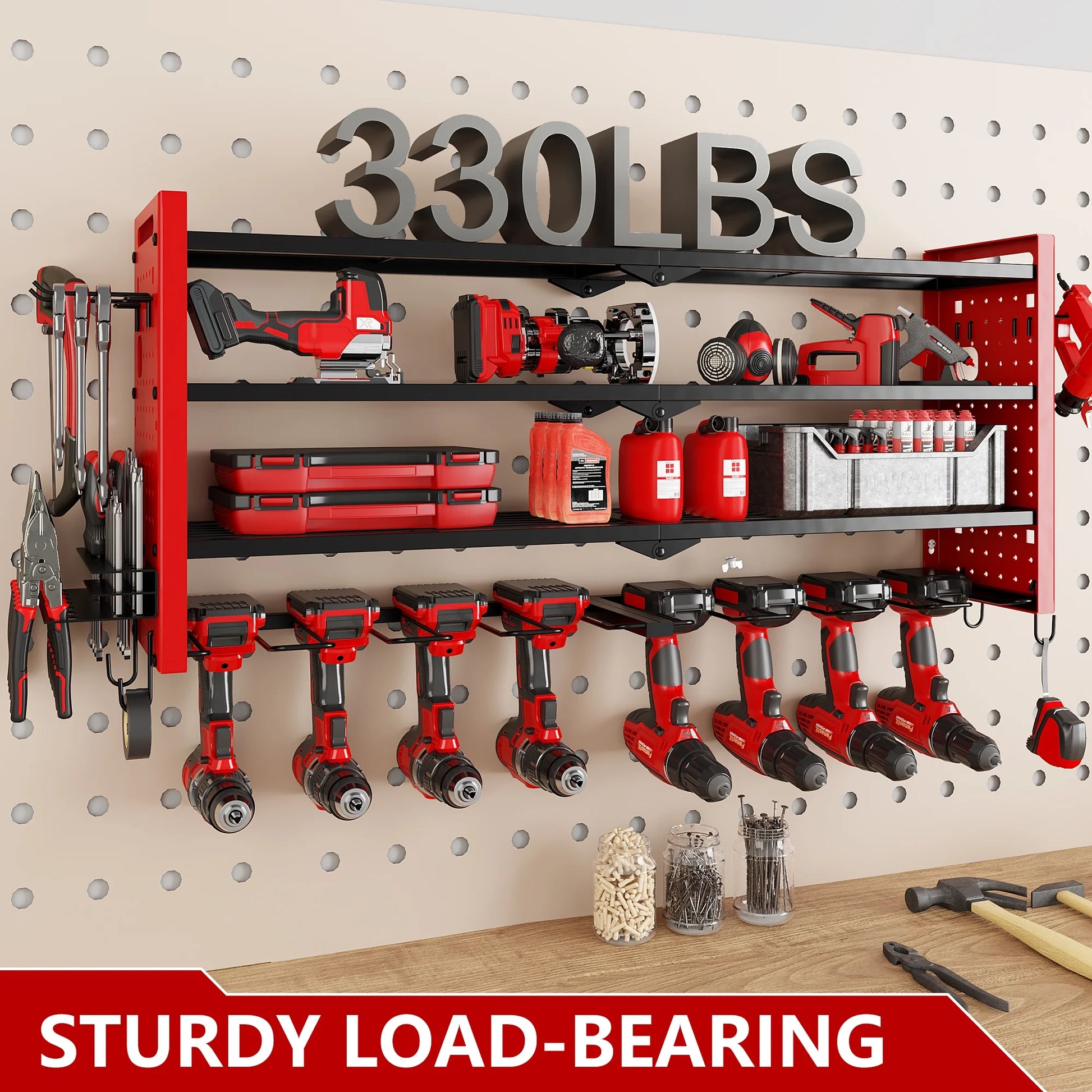 - This tool organizer has three shelves and eight drill slots, plus hooks and drill bit holders for mounting on bilateral pegboards, it is ideal for storing a lot of power and hand tools.