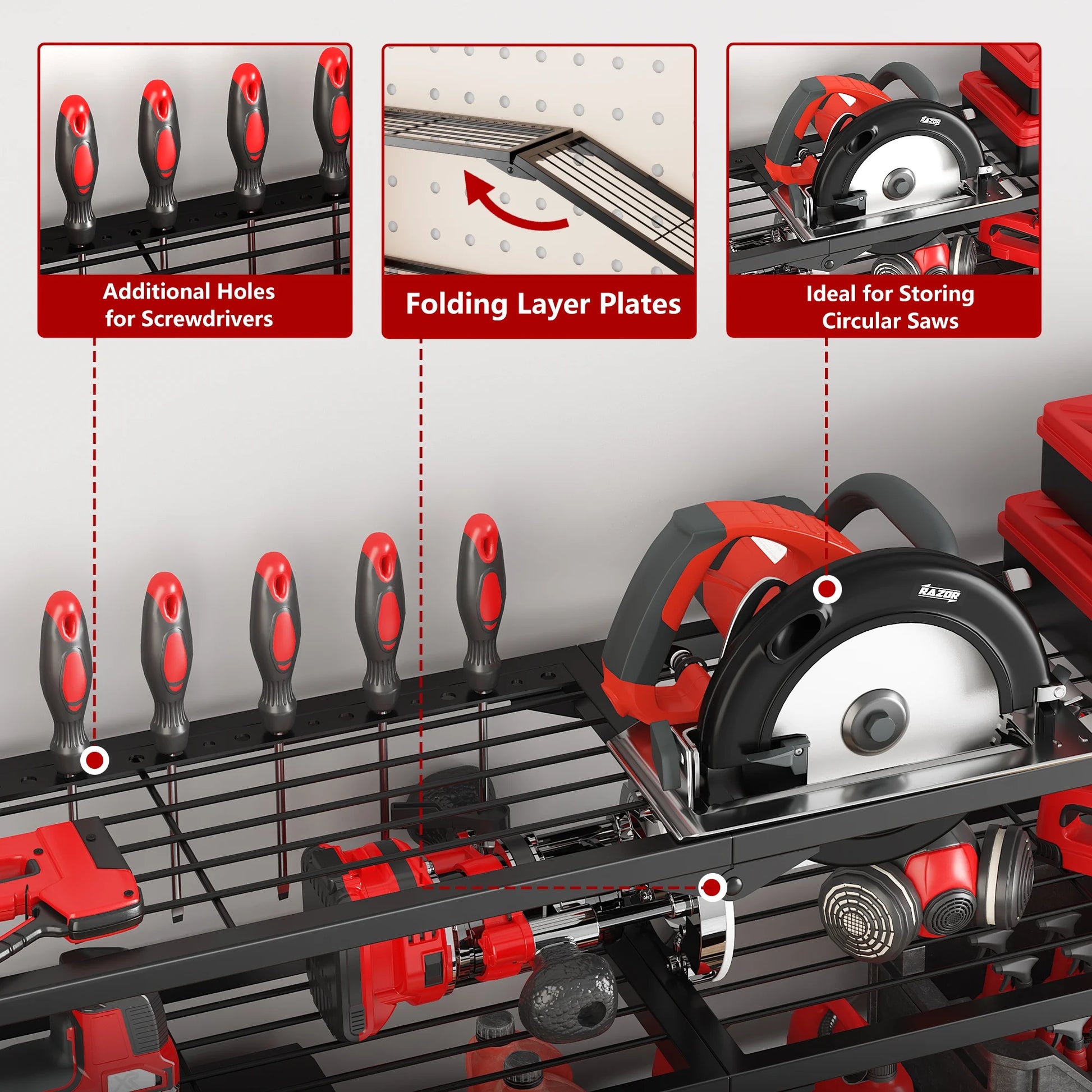 This 4-Tier Power Tool Rack is professional and can organize a large number of variant power tools. It is thoughtfully equipped with different tool slots and hooks to fulfill your storage needs as much as possible.