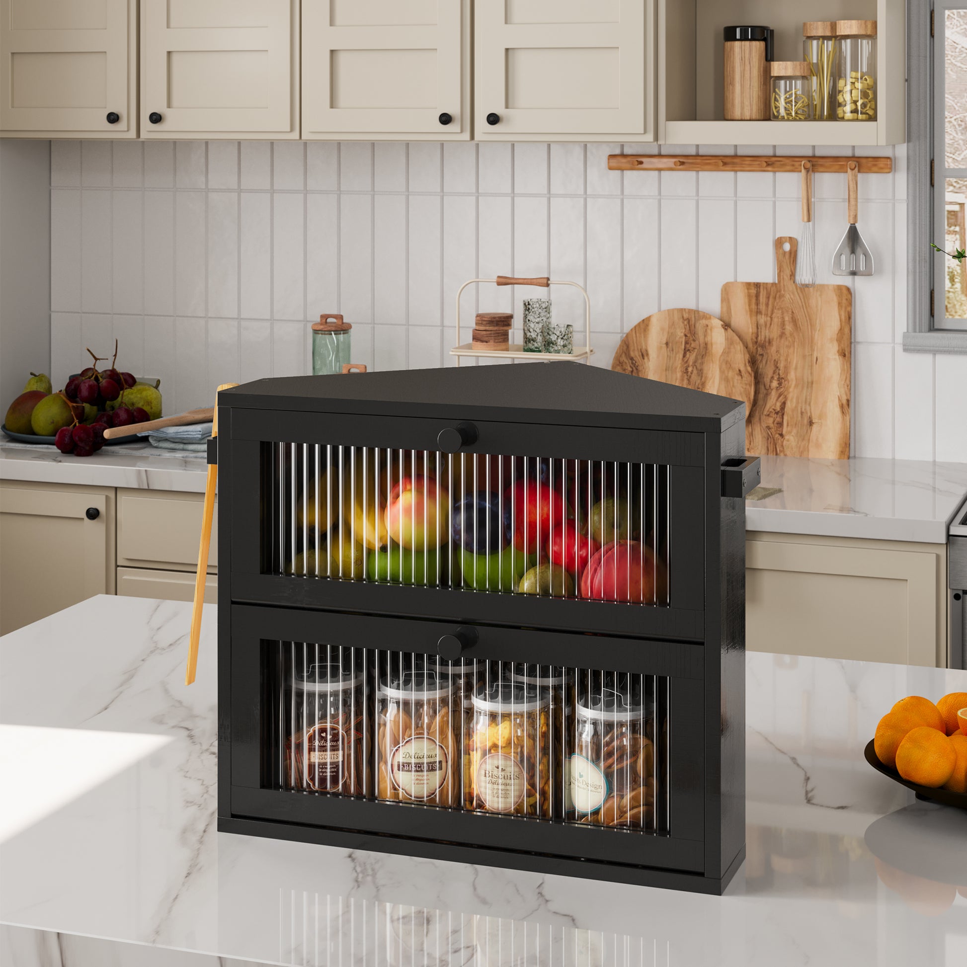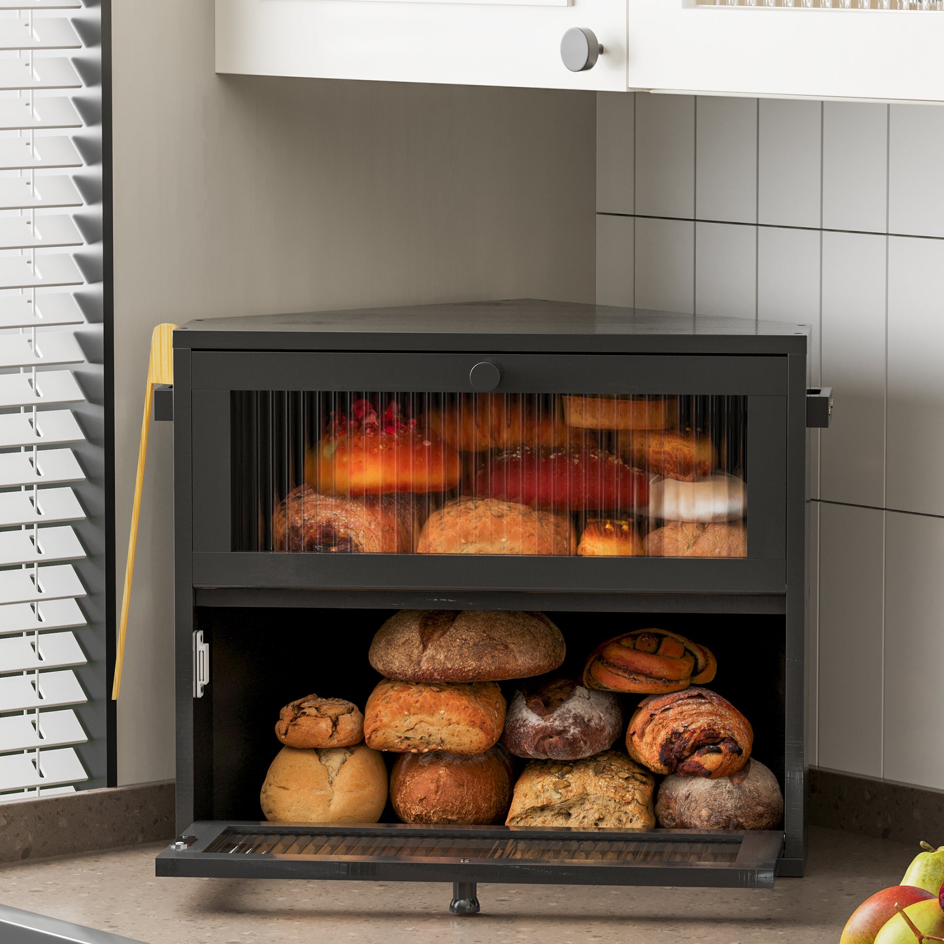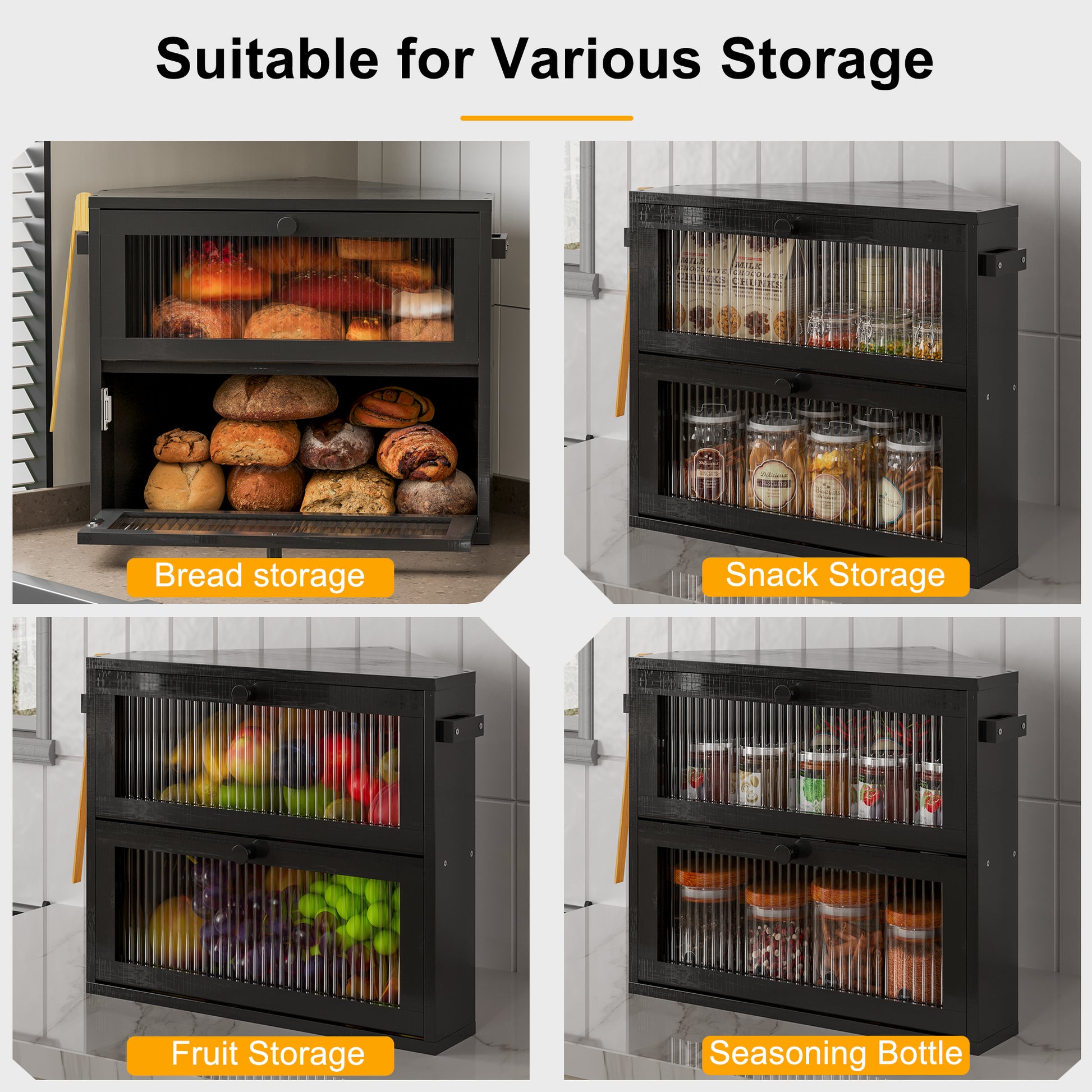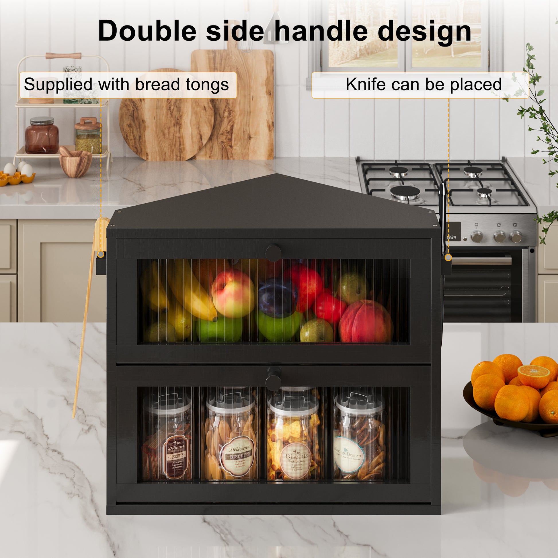 BGTREND Corner Bread Box for Kitchen Countertop, Large Double Layer Bread Storage Container for Homemade Bread, Black Bread Holder for Kitchen Counter, Under Cabinet Organizer (Black, Medium)