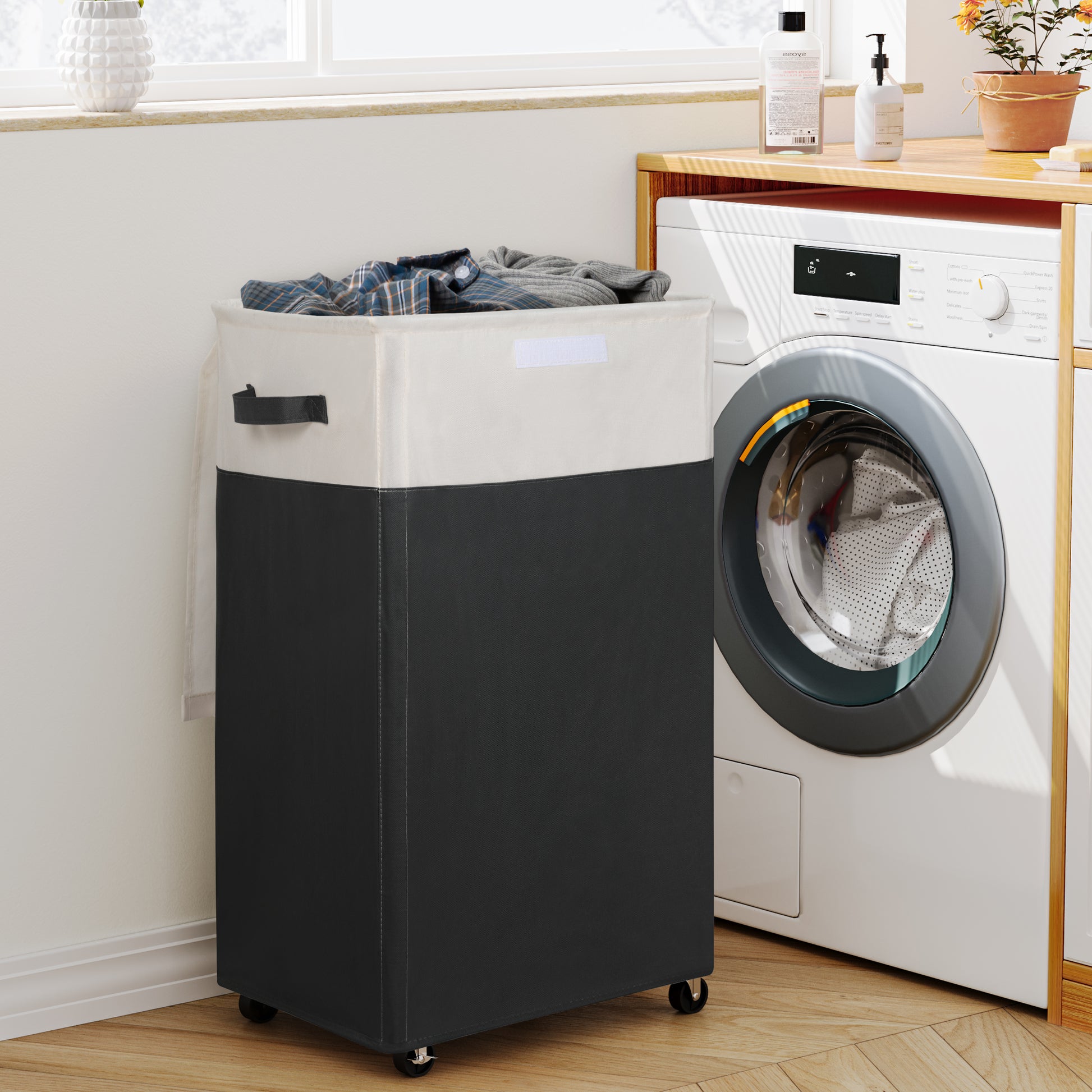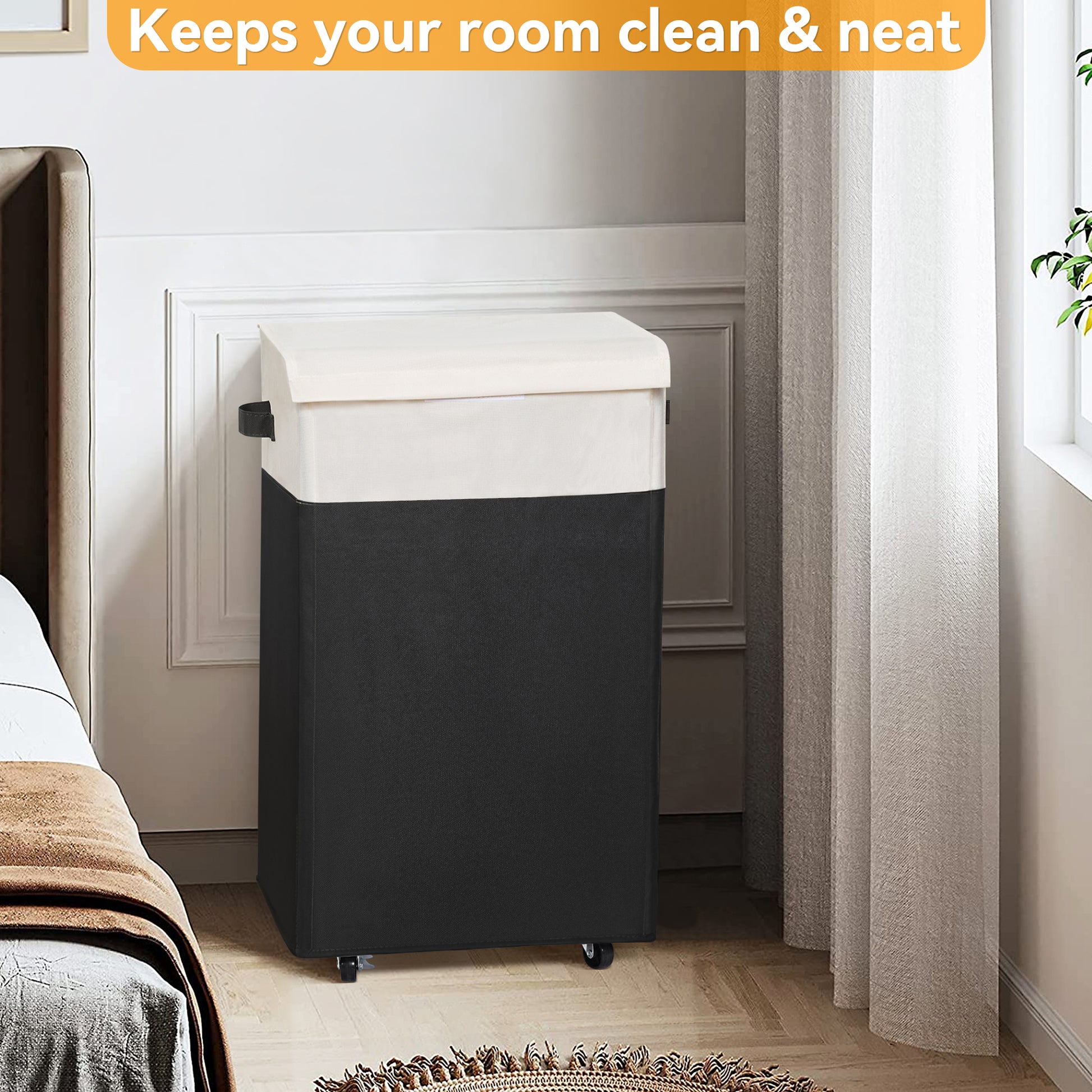 - [FlexibleWheels] The flexible wheels make this dirty clothes basket easy to move. It can slide smoothly on flat surfaces even when carrying heavy clothes, so you can push or pull it to the laundry room effortlessly. Two of the wheels can be locked manually to prevent the hamper from moving without notice;