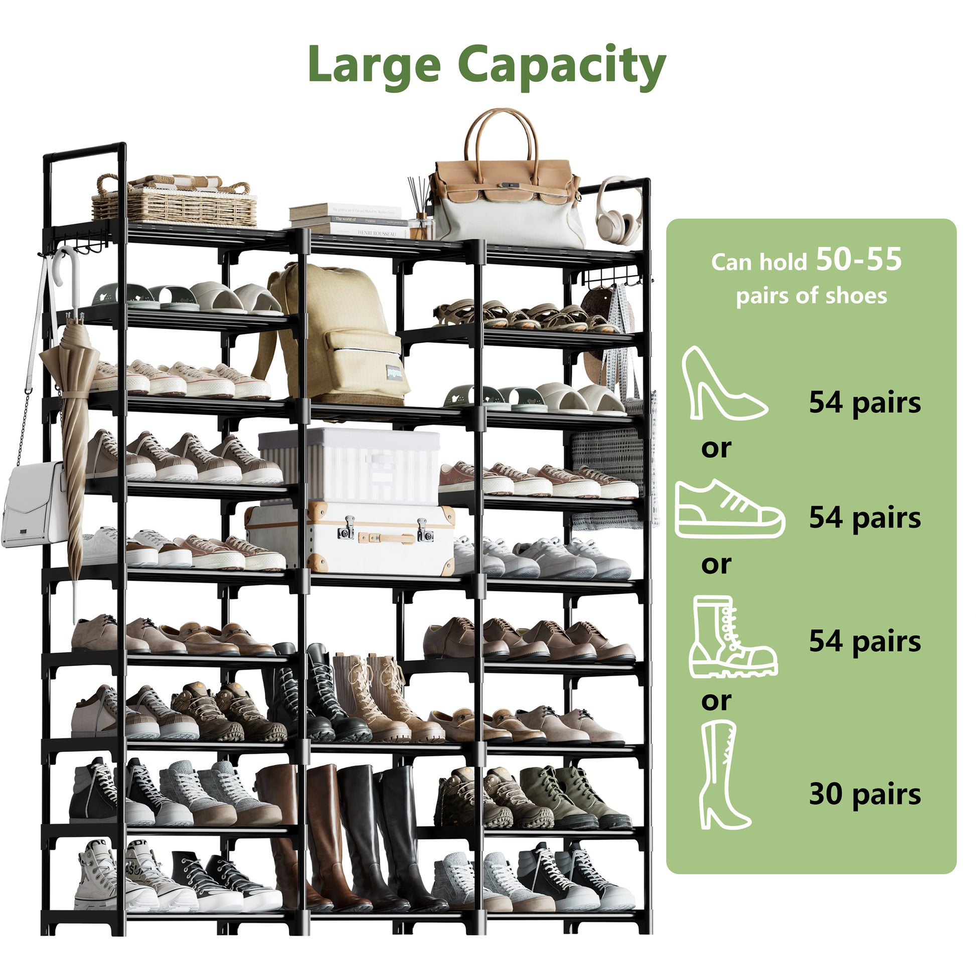 - [Large Capacity Shoe Organizer]:Fully assembled size of the shoe holder is 50W x 11.75D x 62.25H inches. The heightened mode provides more space to extend upwards and can store up to 50-55 pairs of shoes, making your space more tidy and organized—good news for small areas.