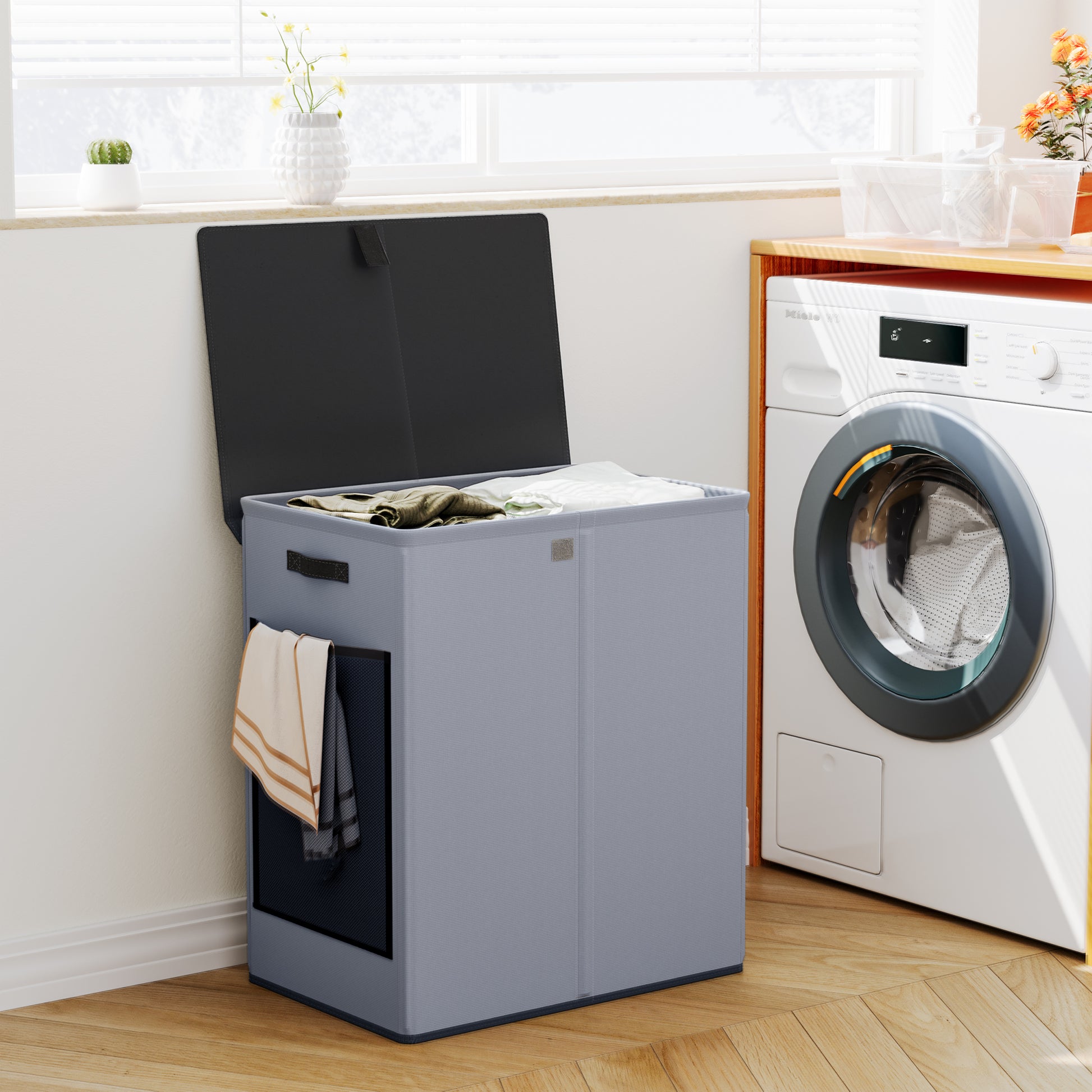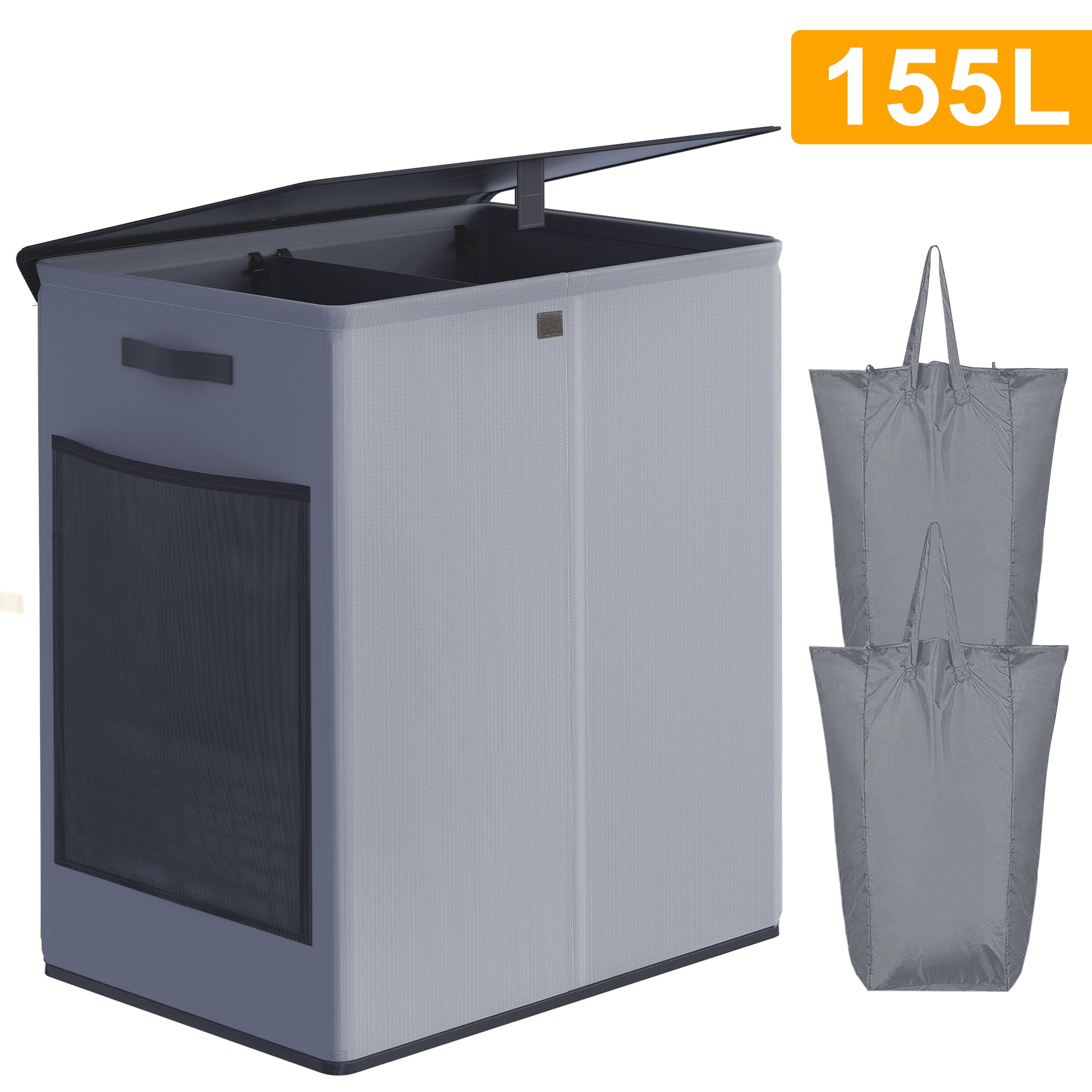 BGTREND Double Laundry Hamper with Lid 155L Laundry Basket with Removable Liner Bags & Side Mesh Pocket Collapsible Laundry Sorter Dirty Clothes Hamper (Gray)