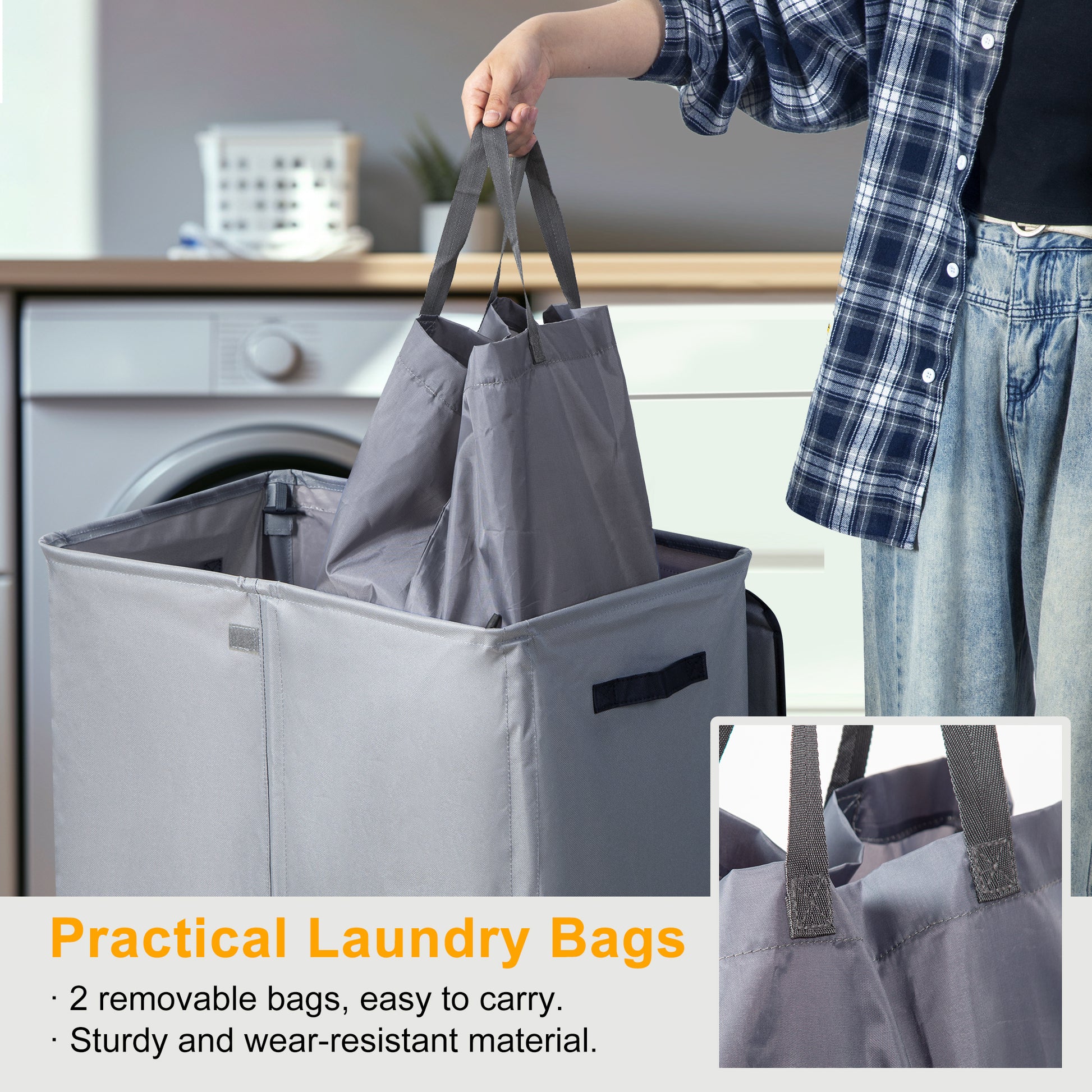 - [Double Compartment Structure]This divided laundry hamper equipped with 2 removable laundry bags makes it simple and easy to sort and organize clothes. You can use them to separate your dark and light clothes, to conveniently take a pack of clothes out from the hamper and then carry it to the washer;