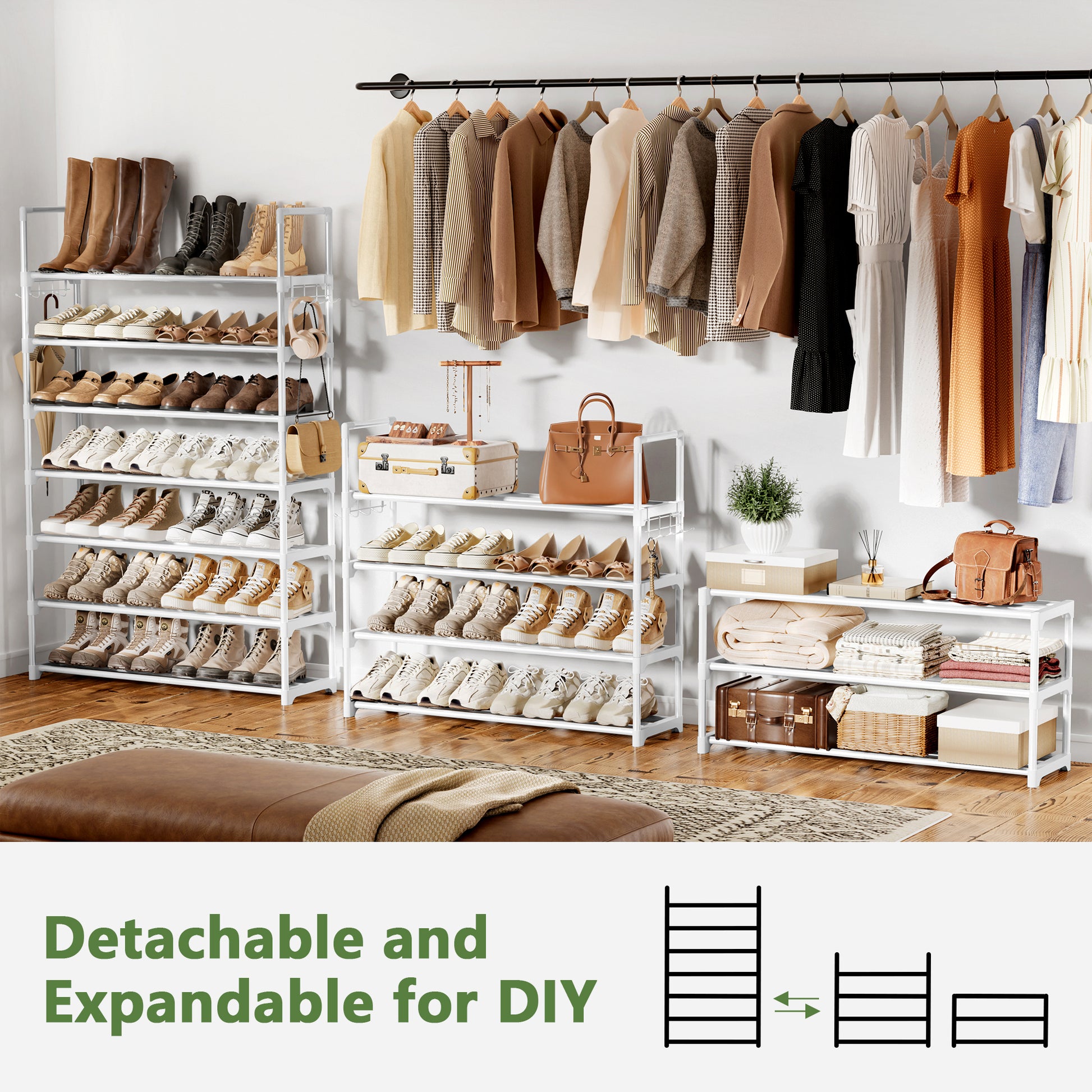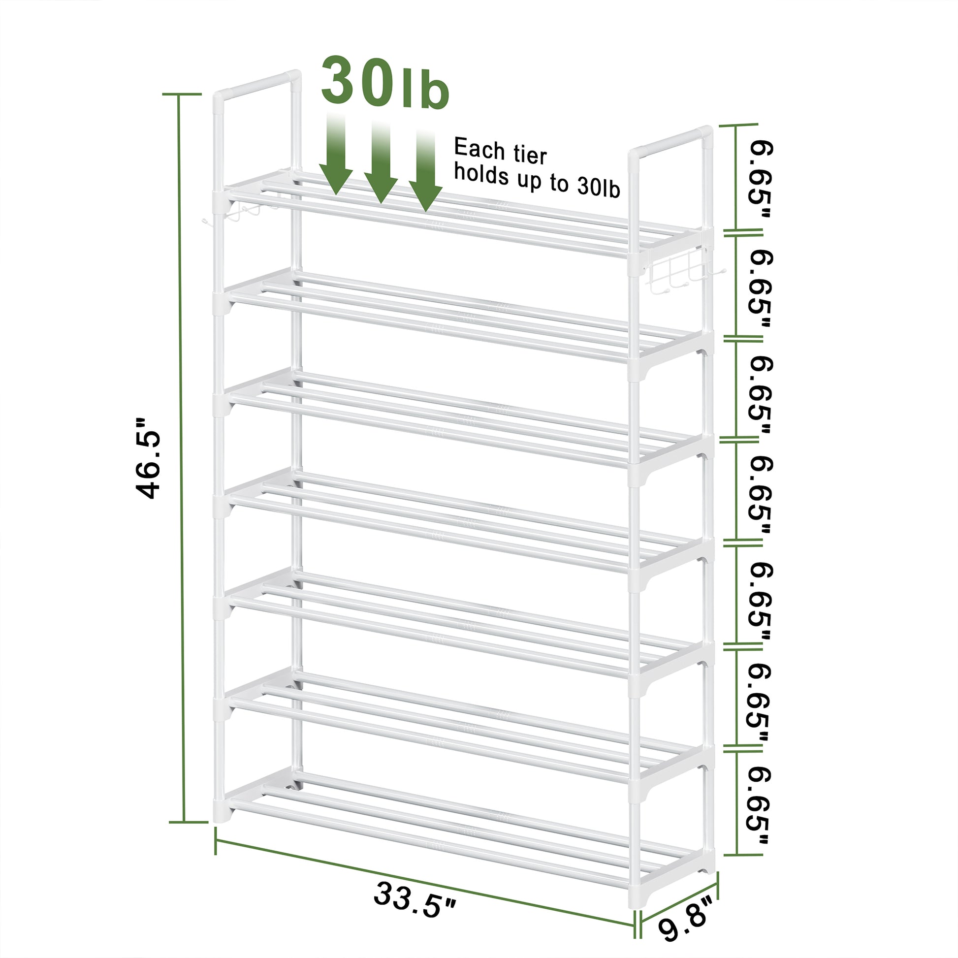 - [Utility Storage]: The metal shoe rack has 7 tiers and can easily hold up to 30 pairs of shoes. Additional hooks on the side can be used to hang small accessories such as hats, keys and umbrellas.