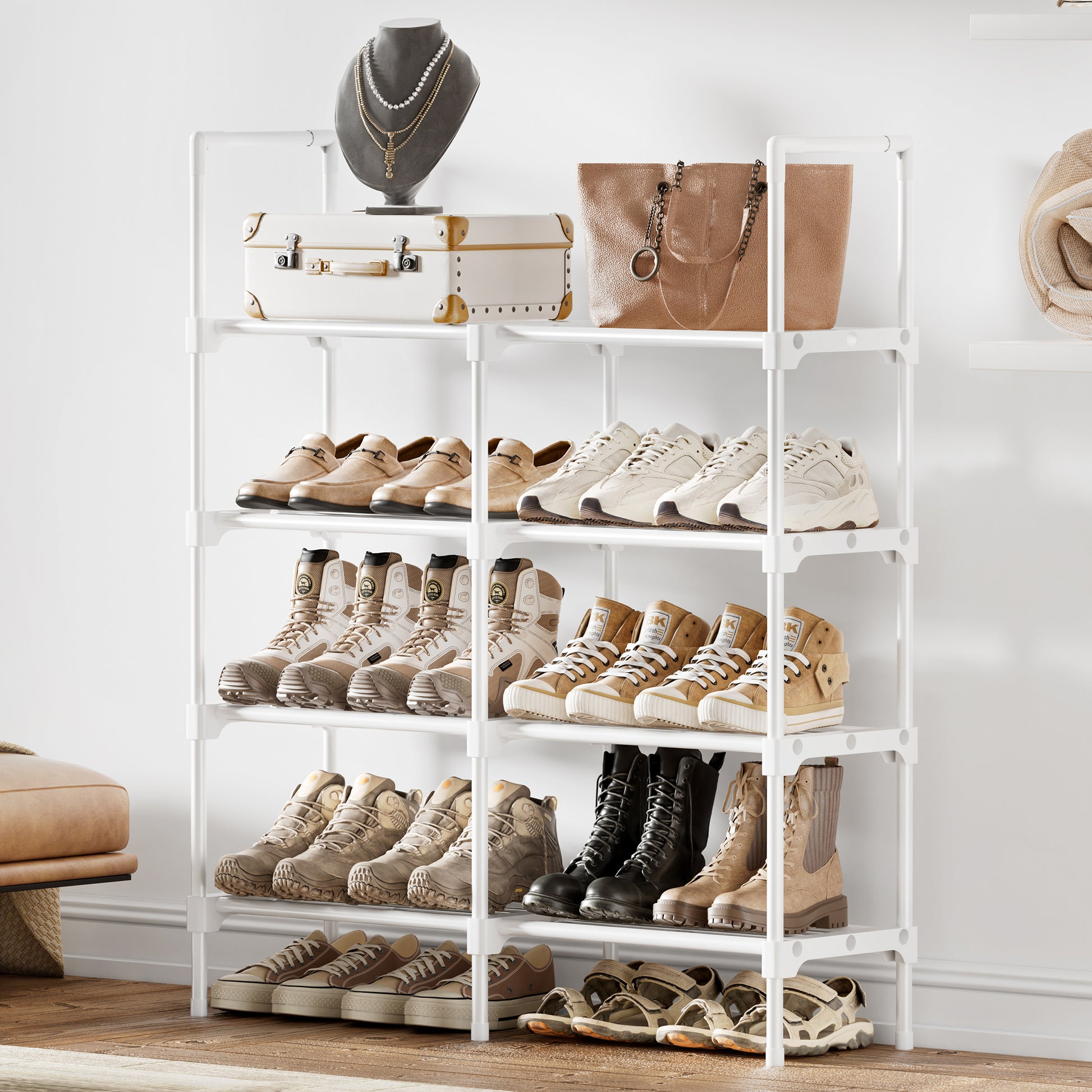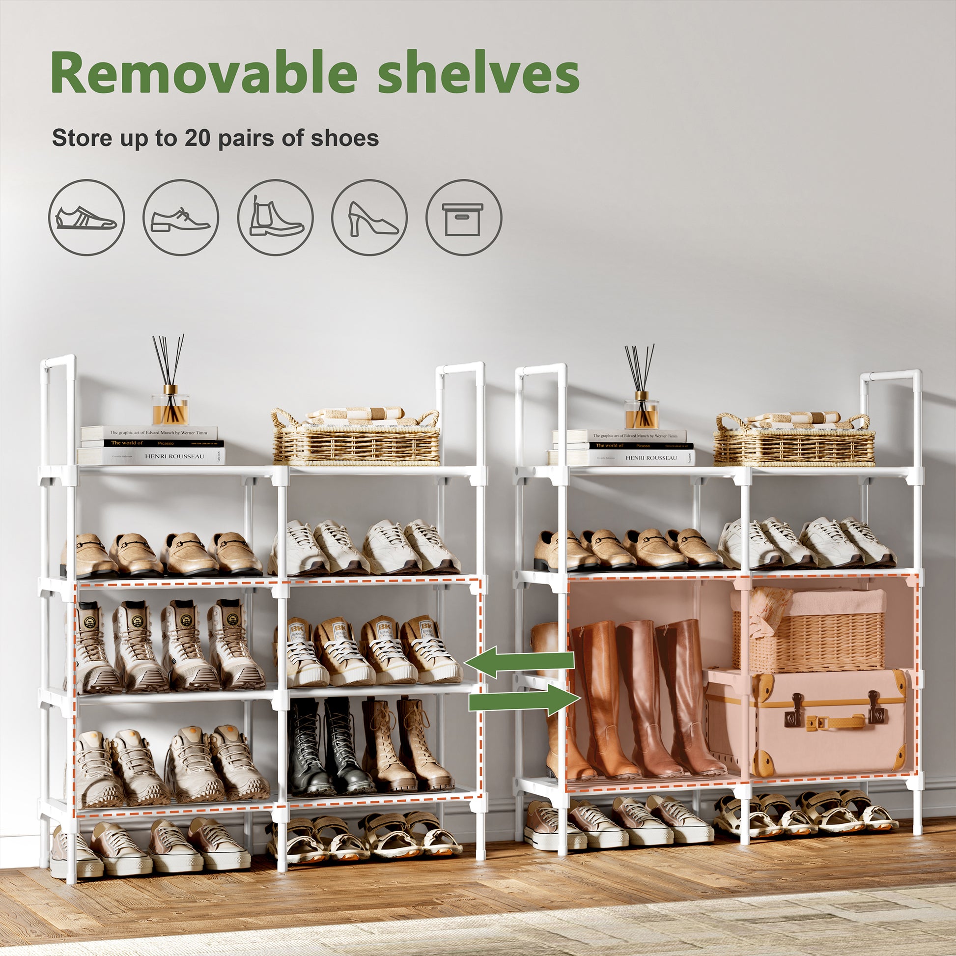 - [Utility Storage]: This 4 tiers and 2 rows metal shoe rack can easily hold up to 20 pairs of shoes. Additional hooks on the side can be used to hang some of your small accessories such as hats, keys and umbrellas.